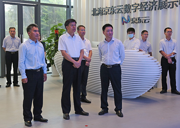 2020年6月11日下午,北海市委書記王乃學(xué)同欽州市委書記許永錁?biāo)暑I(lǐng)的欽州市黨政代表團(tuán)到中國電子北部灣信息港調(diào)研,參觀了北海京東云數(shù)字經(jīng)濟(jì)展示中心、京東網(wǎng)紅直播基地,聽取企業(yè)負(fù)責(zé)人介紹生產(chǎn)經(jīng)營等方面的情況。